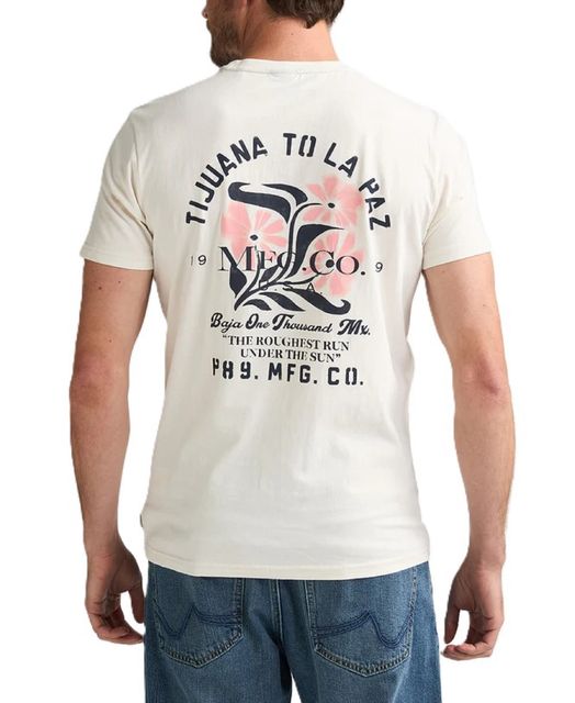 Kurzarm-T-Shirt mit Rundhalsausschnitt in normaler Passform. Gerippter Kragen und robuste Doppelnaht. Unauffälliger Brustprint mit größerem Rückenprint. Mit gestreiftem Nackenband innen am Kragen und kleinem gewebtem Label an der Seitennaht.