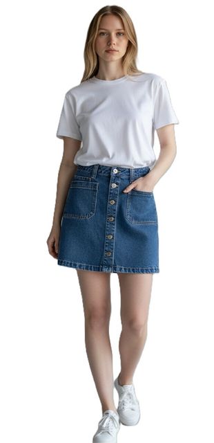 Der vorne durchgeknöpfte A-Linien-Rock ist perfekt für lässige Anlässe. Die knapp knielange leicht ausgestellte Passform mit der durchgängigen Nietenknopfleiste unterstreicht den sportiven Charakter dieses frechen Jeansrocks und wird durch die 2 vorne aufgesetzten Taschen perfektioniert.